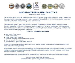 The Leicester Regional Public Health Coalition (LRPHC) is reminding residents that the current respiratory illness season is underway. Seasonal viruses such as influenza (flu), COVID-19, RSV, and other common respiratory infections are circulating in our communities.